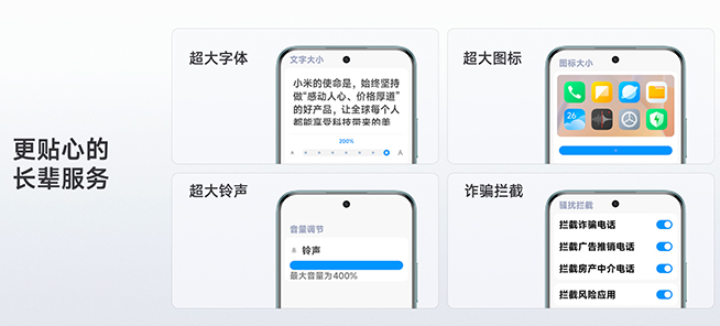 專(zhuān)為老年人群設(shè)計(jì)「長(zhǎng)輩關(guān)懷」功能,支持對(duì)字體大?。ㄗ畲罂烧{(diào)至 200%)、圖標(biāo)大?。烧{(diào)大約 10%)、鈴聲音量(最大可調(diào) 400% 大音量)、攔截詐騙電話(huà),攔截廣告推銷(xiāo)電話(huà)、攔截房產(chǎn)中介電話(huà)、攔截風(fēng)險(xiǎn)應(yīng)用的調(diào)節(jié),一站式調(diào)節(jié)適老功能,讓老人能看得清、聽(tīng)得見(jiàn)、不被騙。