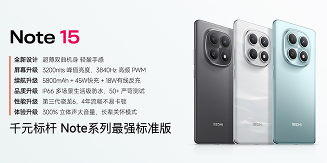 REDMI Note 15 定位千元標(biāo)桿,Note系列最強(qiáng)標(biāo)準(zhǔn)版。外觀采用同檔唯一雙曲設(shè)計(jì),178g重、7.35mm厚,手感輕盈,握持舒適。屏幕升級(jí) 6.77" 3200nits超級(jí)陽(yáng)光屏,支持3840Hz 高頻PWM + DC調(diào)光。續(xù)航升級(jí) 5800mAh + 45W快充 + 18W有線反充。同時(shí)支持IP66多場(chǎng)景生活級(jí)防水和濕手觸控2.0,通過(guò)1.7米花崗巖極限面跌測(cè)試、50多項(xiàng)品質(zhì)測(cè)試,獲得 CQC 嚴(yán)苛環(huán)境卓越品質(zhì)認(rèn)證。配備300%立體聲大音量和長(zhǎng)輩關(guān)懷模式,更適合老年群體,是目前千元機(jī)中最值的購(gòu)買(mǎi)的新品。