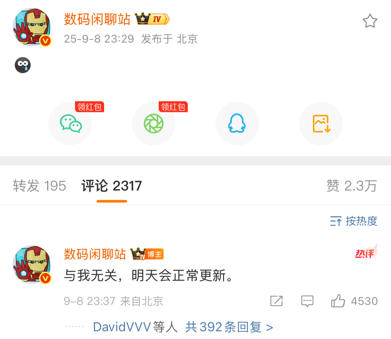 值得一提的是,此前被許多網友調侃為“王騰小號”的微博數(shù)碼大V“數(shù)碼閑聊站”,9月8日晚在北京發(fā)布消息稱“與我無關”。不過對此辟謠依然有部分網友表示懷疑,有人認為數(shù)碼閑聊站是工作室在運營,平時多人上號,王騰是其中之一。