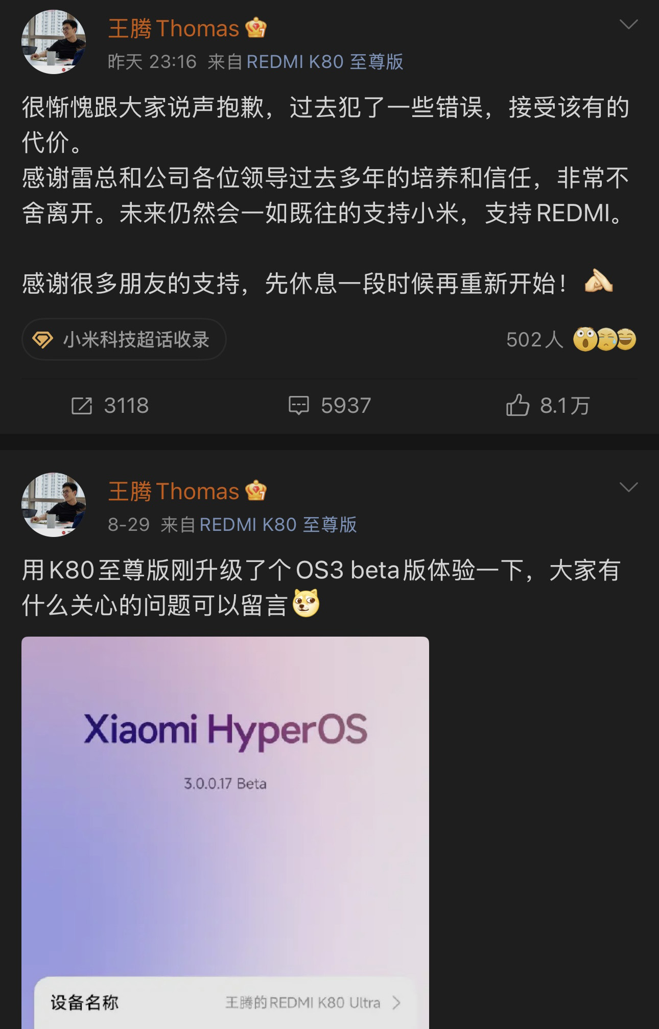 據觀察,王騰的社交平臺賬號一直很活躍,但過去10天罕見未更新,目前其認證信息以及簡介均已清空。9月8日晚,王騰在微博發(fā)布了其本月首條微博,稱“很慚愧”、“過去犯了一些錯誤”、“會一如既往的支持小米”、“先休息一段時間”。“王騰發(fā)博致歉”迅速登上微博熱搜榜首。