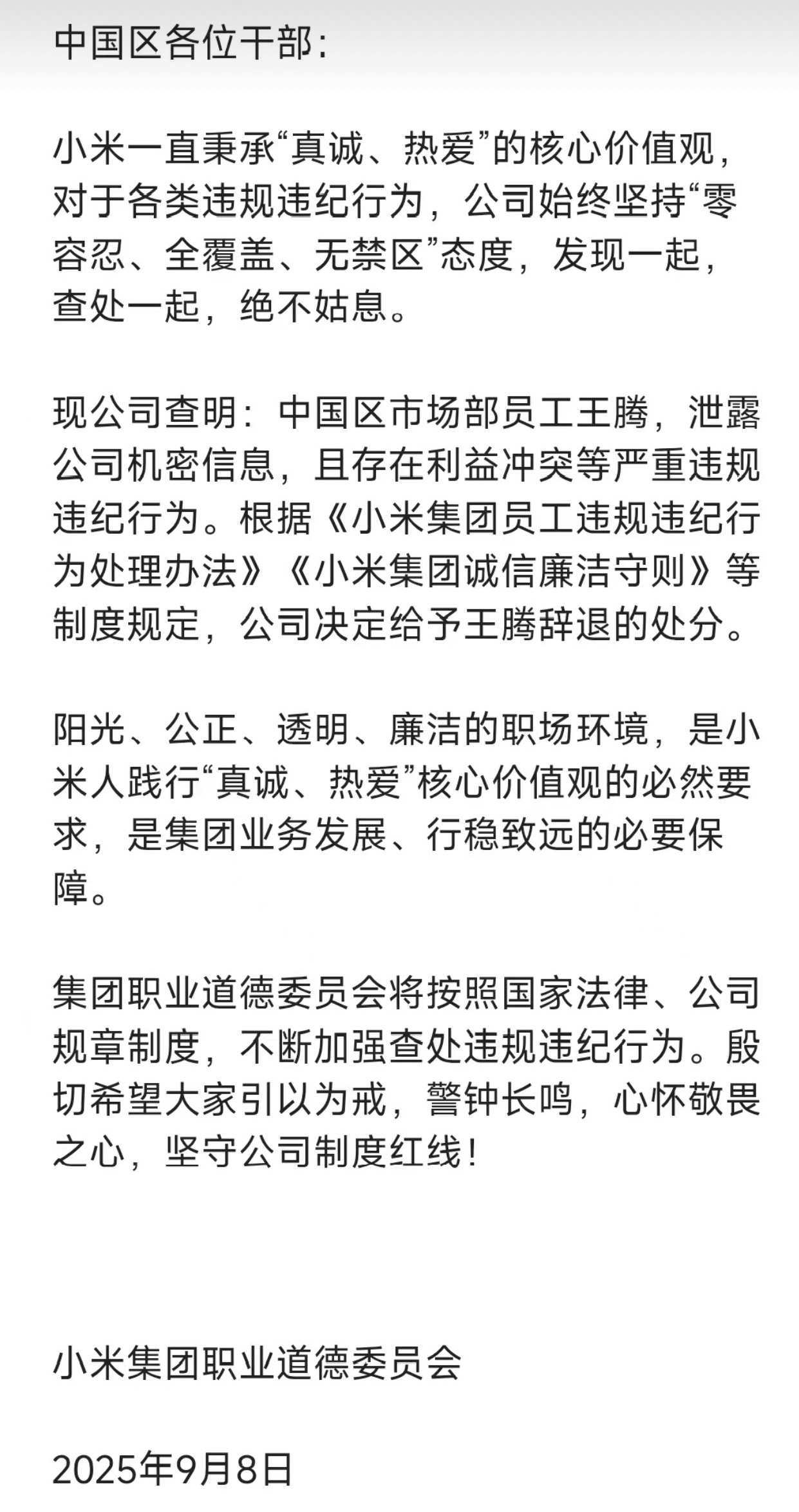 9月8日晚,鳳凰網科技率先發(fā)布消息稱,小米王騰被辭退。此處的王騰正是網友所熟知的小米集團中國區(qū)市場部總經理、REDMI總經理王騰。根據曝光的小米內部郵件,王騰是因“泄露公司機密信息”、“利益沖突”等嚴重違規(guī)違紀行為,小米給予辭退處理。