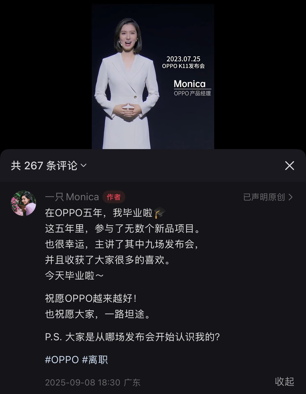 同樣是在9月8日,知名OPPO女產品經理Monica在小紅書發(fā)布視頻正式與OPPO告別,稱“在OPPO五年,我畢業(yè)啦”。顏值和氣質出眾的Monica,是手機圈公認的美女,人氣較高,她在OPPO主講了九場發(fā)布會,并參與眾多新品項目。