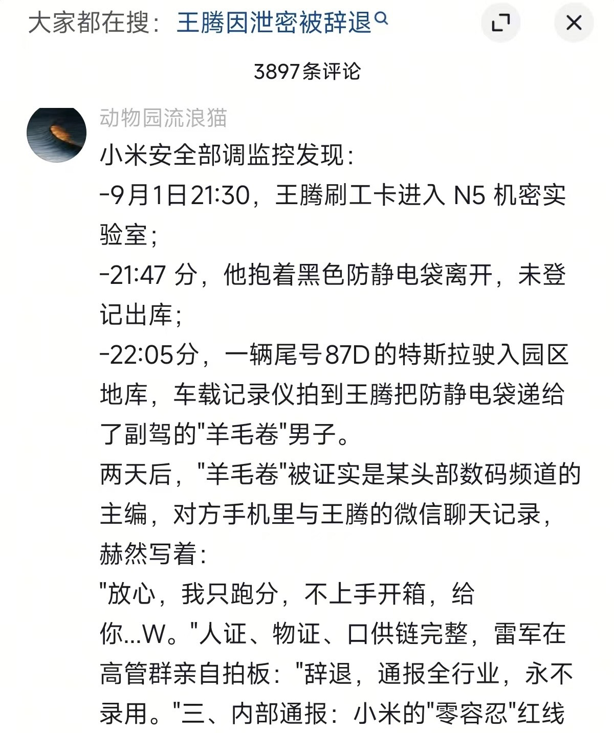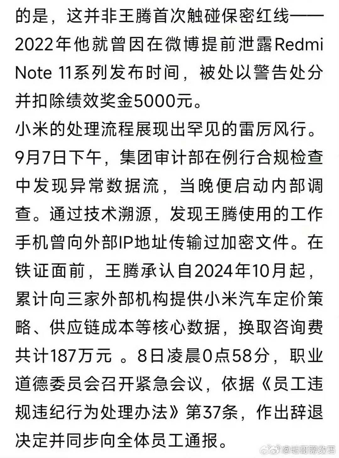 王騰致歉后,網絡上傳出一些未知真假的爆料,有的稱其泄密小米汽車定價策略、供應鏈成本等核心數(shù)據,換取咨詢費共計187萬元。還有的稱王騰被小米安全部監(jiān)控發(fā)現(xiàn)從機密實驗室取出產品,提供給某頭部數(shù)碼頻道的主編跑分。
