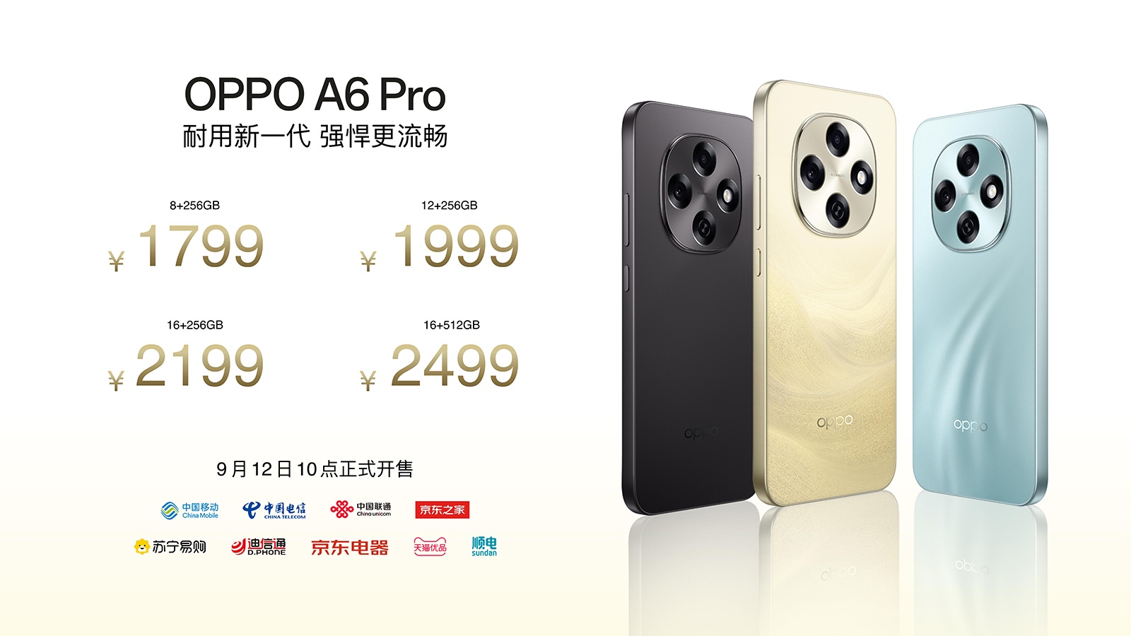 OPPO A6 Pro可選金色、青色、黑色三款顏色,閃存規(guī)格為UFS 3.1,8GB+256GB定價1799元,12GB+256GB為1999元,16GB+256GB為2199元,16GB+512GB為2499元,將于9月12日發(fā)售。