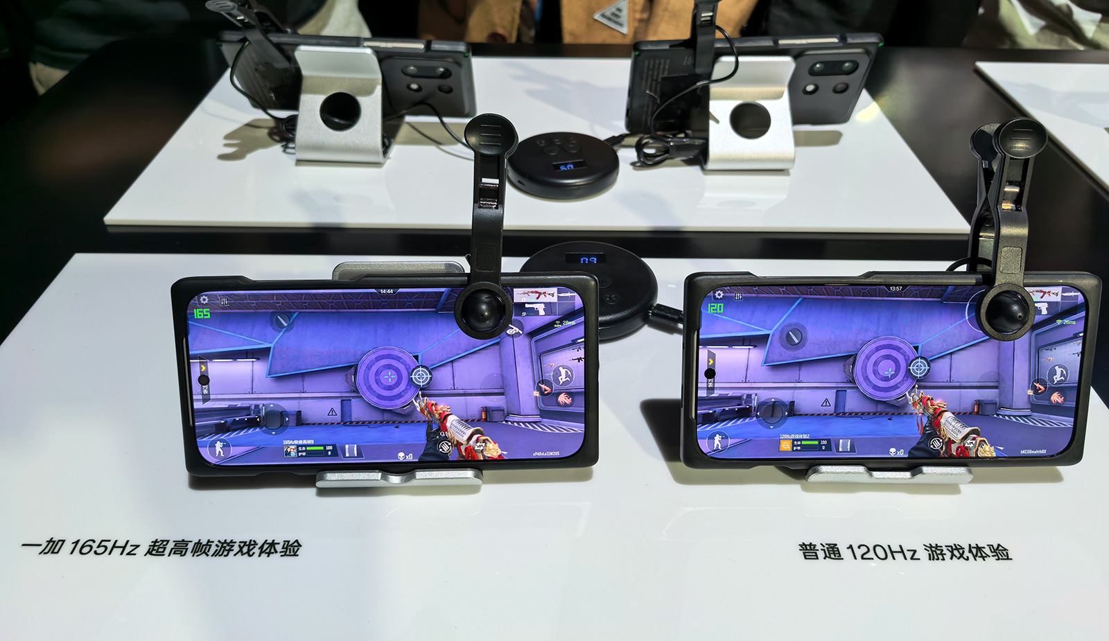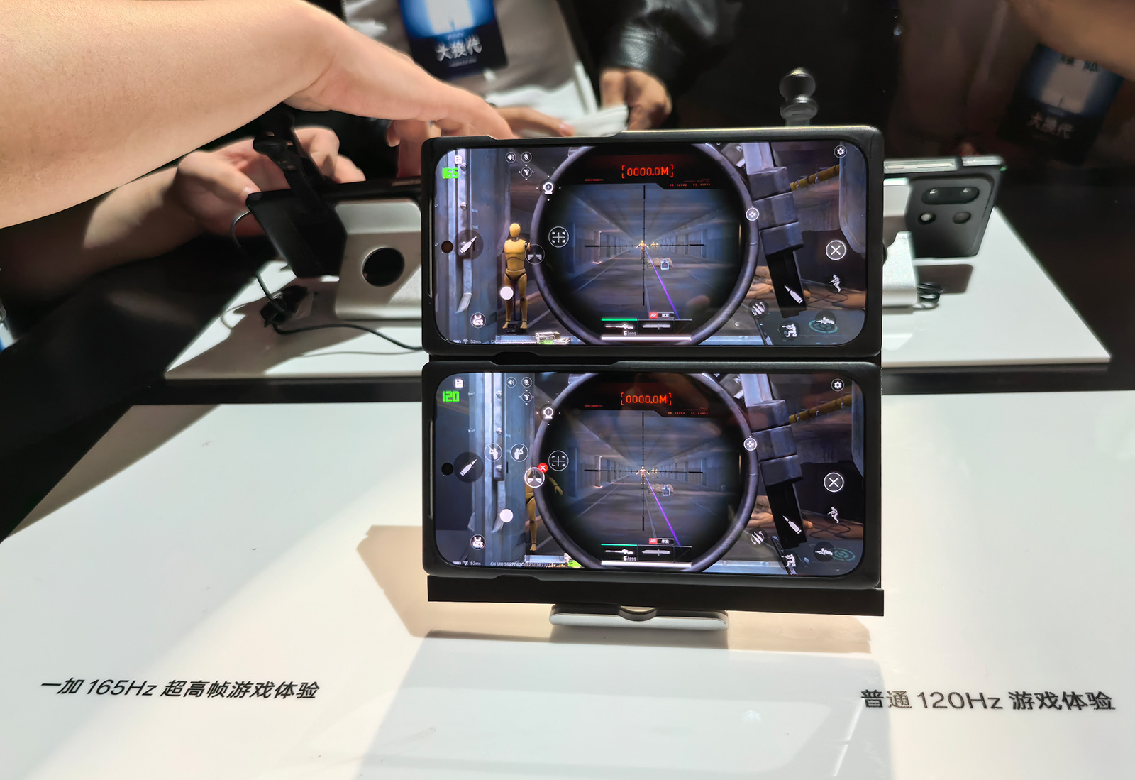 透過現(xiàn)場(chǎng)體驗(yàn)區(qū)165FPS和120FPS同款射擊游戲的對(duì)比,165FPS超高幀下,玩家明顯能夠更快發(fā)現(xiàn)敵人,開槍開鏡頻率也能更快。