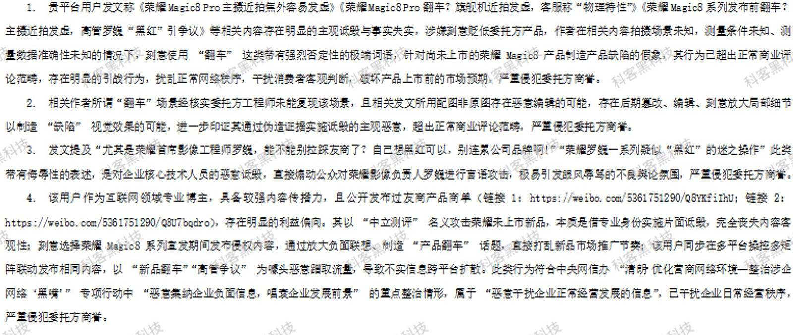 產品問題解決不了,那就解決提出問題的人?!來來來,看看榮耀團隊做的“好事”!近期科技網站科客反饋的榮耀Magic8 Pro近拍發(fā)虛問題,榮耀不是積極解決問題,而是在各平臺瘋狂惡意投訴,無所不用其極,欺人太甚!