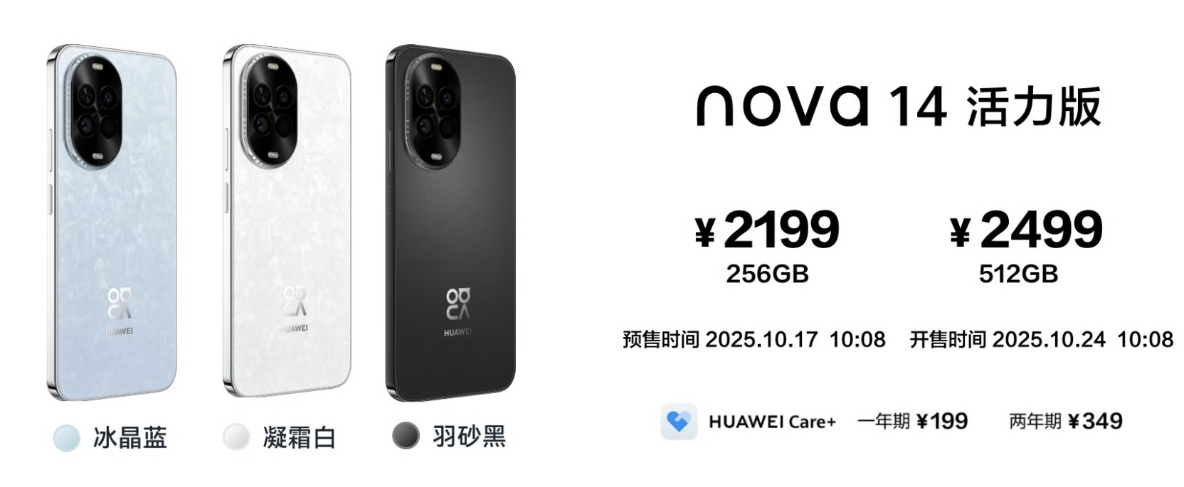 華為nova 14活力版可選三款顏色,256GB和512GB價格分別為2199元和2499元,部分渠道上市價優(yōu)惠50元。