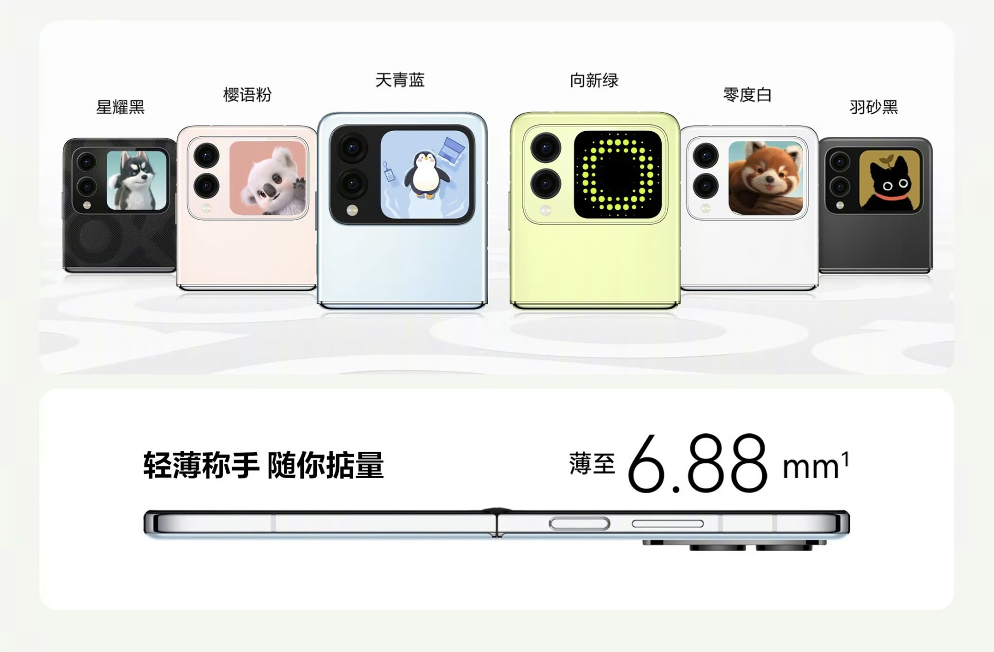 這款小折疊新品有6款顏色,重195克,展開后薄至6.88毫米,內(nèi)屏6.94英寸,擁有5000萬像素主攝和800萬像素超廣角鏡頭,外屏2.14英寸,4400mAh電池配66W快充。