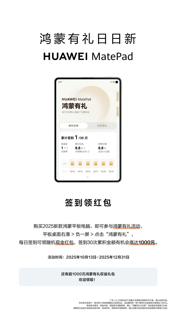 此外,入手了華為MatePad Mini的朋友記得參與華為MatePad系列鴻蒙有禮日日新簽到領(lǐng)紅包活動,簽到30次有機(jī)會累積1000元現(xiàn)金紅包。不僅產(chǎn)品力優(yōu)秀,還有華為給力的寵粉福利,難怪華為MatePad Mini能成為又一爆款,喜歡的朋友勿錯過入手良機(jī)。添加科客公眾號kekebat,獲取更多精彩資訊。