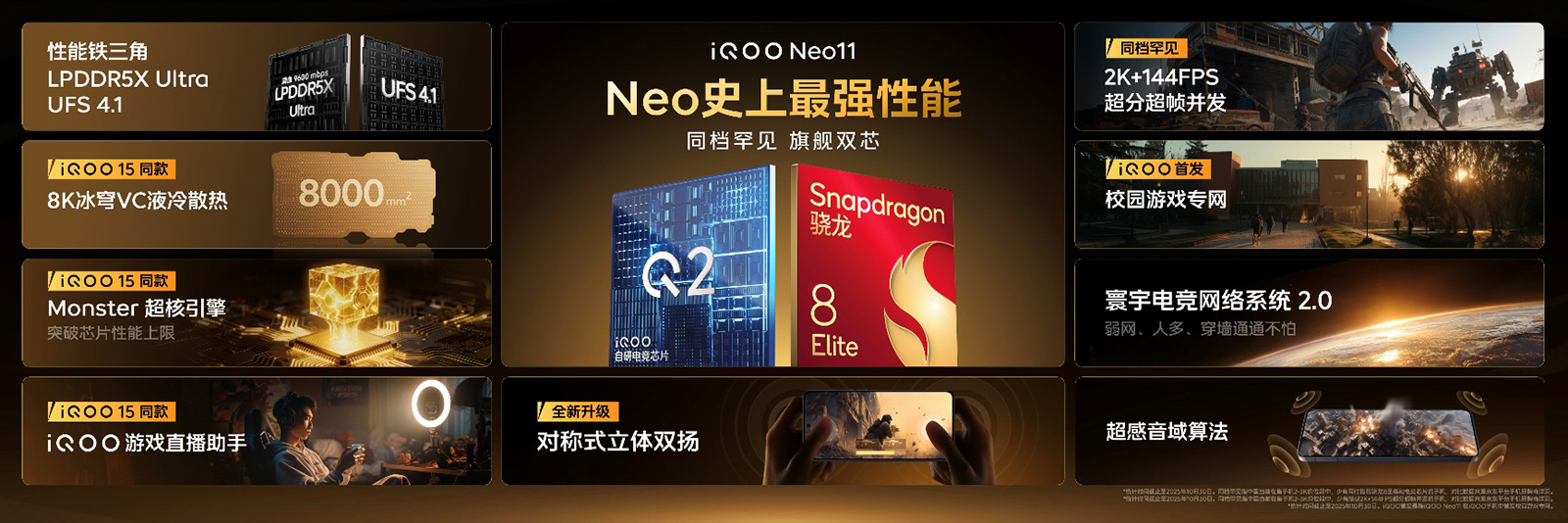iQOO Neo11 搭載由驍龍 8 至尊版與自研電競芯片 Q2 組成的“旗艦電競雙芯”,并在 Monster 超核引擎支撐下,帶來優(yōu)秀的 1% Low 幀表現(xiàn)、全新升級的 PC 級 2K 紋理超分、原生級 144FPS 無損超幀以及超分超幀并發(fā),實現(xiàn)行業(yè)領先的游戲視效;更以 8K 冰穹 VC 液冷散熱、7500mAh 超薄藍海電池、AR 增透膜等多項 iQOO 15 同款配置、高質感金屬玻璃機身和 IP68 & IP69 防塵防水等,共筑一款更優(yōu)秀的強悍標準版。