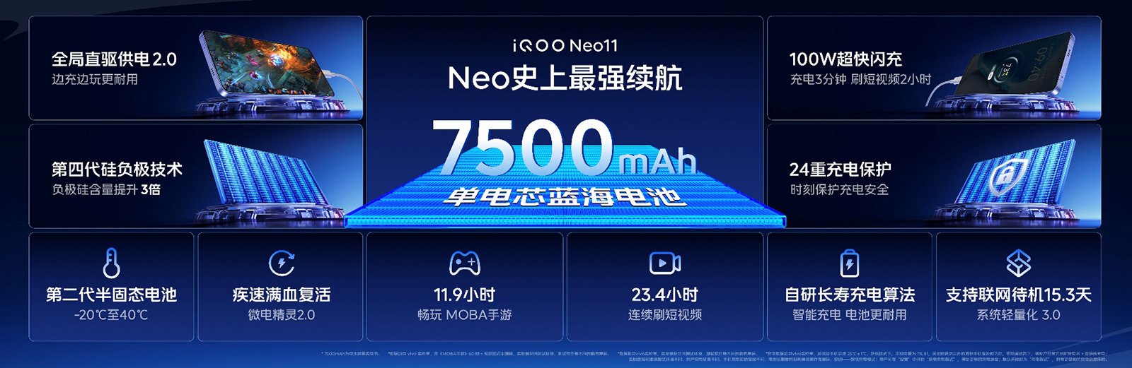 Neo11 實現(xiàn) Neo 史上最強續(xù)航表現(xiàn),搭載配備了第二代半固態(tài)電池技術和第四代硅負極技術的 7500mAh 超薄藍海電池,即使在 -20℃ ~ 40℃ 的環(huán)境中,依然能穩(wěn)定持久放電,并配備 100W 超快閃充且支持 PPS 和 PD 快充協(xié)議,讓充電更自在;全新升級的全局直驅供電 2.0,支持智能溫控,做到發(fā)熱更低、損耗更少,有效延緩電池老化,邊充邊玩也安心。