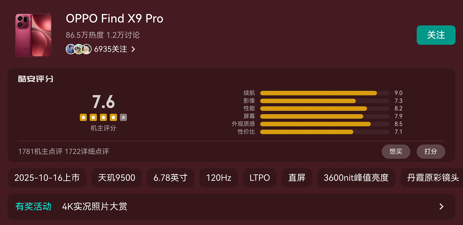 在酷安社區(qū),OPPO Find X9 Pro上市初期的機主評分超過9分,但隨后評分持續(xù)下滑,一度跌至7.5分,截至11月15日分?jǐn)?shù)為7.6分,在多款同期推出的旗艦機中排名墊底,競品得分均在9分以上。頗為諷刺的是,號稱相機的OPPO Find X9 Pro,影像平均評分只有7.3,在六個維度得分中排在倒數(shù)第二,僅略高于性價比的分?jǐn)?shù)(7.1)。很顯然,大量消費者不滿這款手機的影像表現(xiàn)。