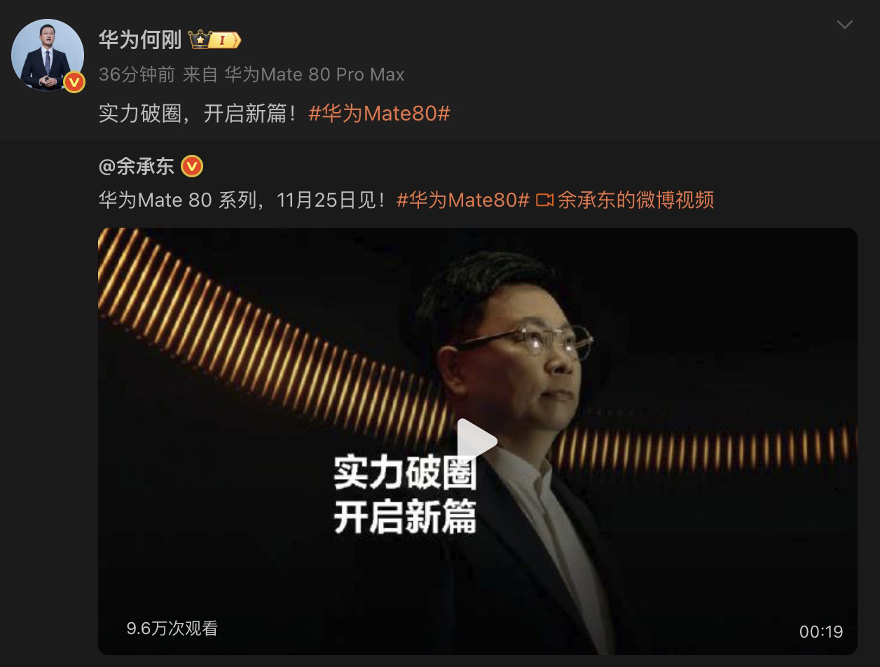 值得一提的是,11月17日華為終端BG董事長余承東和華為終端BG首席執(zhí)行官何剛均使用新機發(fā)了微博,小尾巴顯示“華為Mate 80 Pro Max”,這款機型應該是此前Mate系列Pro+或RS機型的改名,可能會采用6.9英寸甚至更大的直屏。華為曾在2015年推出的華為P8系列中使用過P8 Max機型命名,全新的Mate 80 Pro Max或許也有致敬10年經典機型的特殊含義。