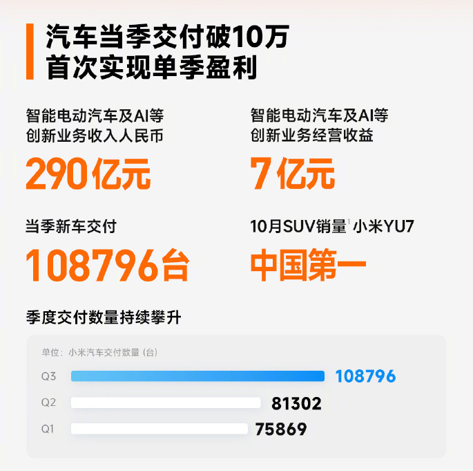 本周小米集團Q3財報顯示,小米汽車首次實現(xiàn)季度盈利(經(jīng)營盈利7億元),Q3營收達到290億元,交付數(shù)量為108796臺,多項重要經(jīng)營指標均再創(chuàng)新高。添加科客公眾號kekebat,獲取更多精彩資訊。