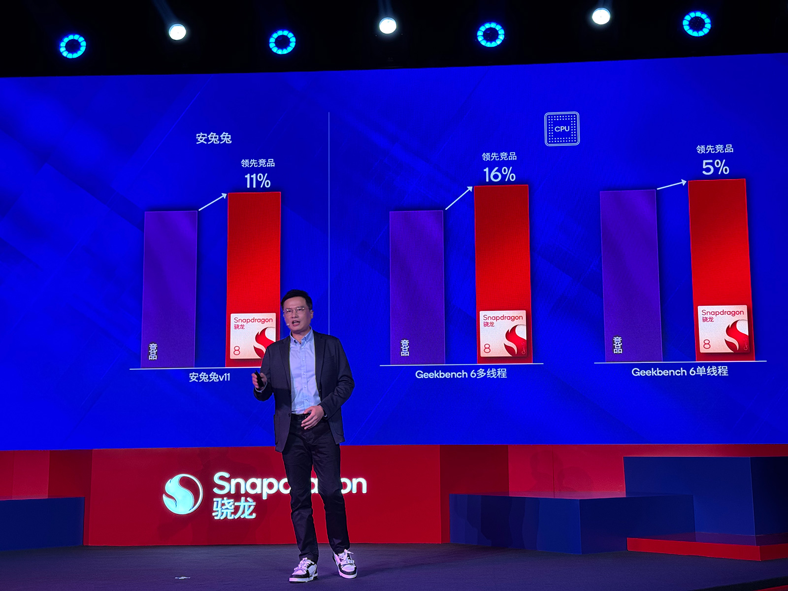高通技術(shù)公司產(chǎn)品市場高級總監(jiān)馬曉民表示,相比競品,第五代驍龍移動平臺運行安兔兔v11的跑分領(lǐng)先11%,在Geekbench測試中,CPU多核表現(xiàn)領(lǐng)先16%,單核領(lǐng)先5%,并且能效也有更優(yōu)秀的成績。