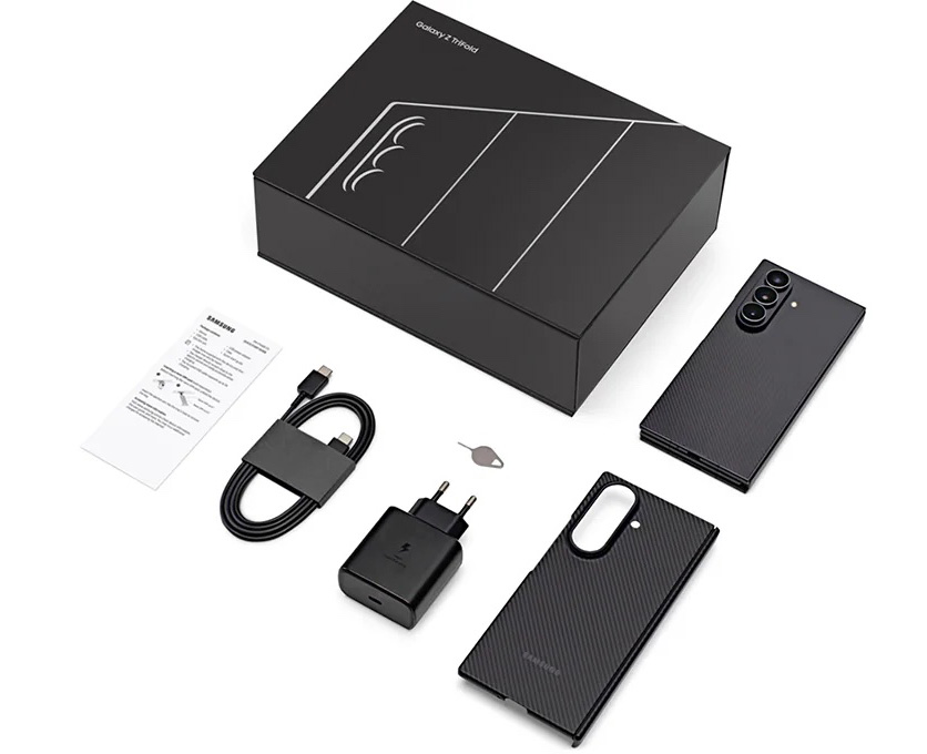 三星Galaxy Z TriFold內(nèi)置三電芯電池,容量5600mAh,視頻播放續(xù)航為17小時。手機(jī)標(biāo)配45W充電適配器,數(shù)據(jù)線為雙USB-C接口,30分鐘充至50%,無線充電可支持15W。