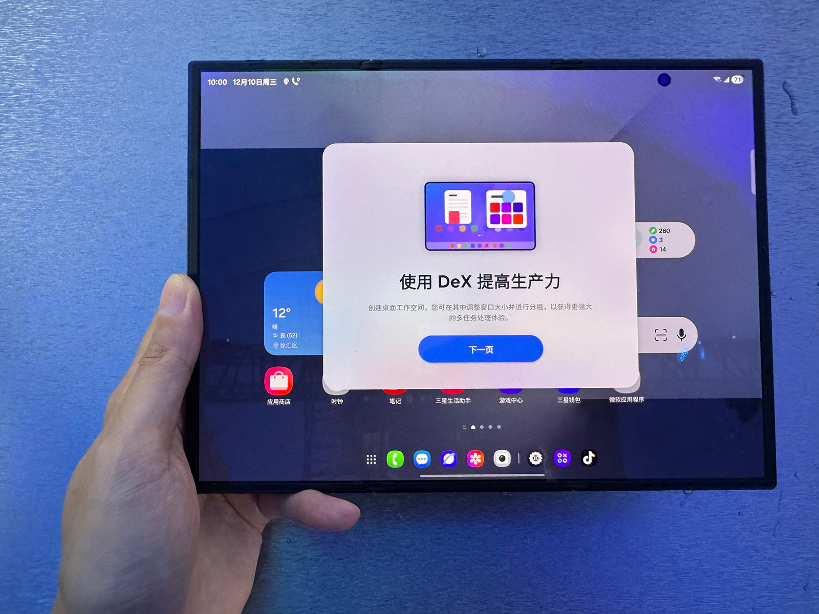 Galaxy AI賦能下,三星三折疊努力打造大屏全能生產(chǎn)力工具。除了靈活運用三分屏、兩分屏多任務(wù)之外,10寸屏的狀態(tài)下,三星Galaxy Z TriFold能夠直接運行Samsung Dex,支持四個桌面,每個桌面可同時運行五個應(yīng)用,App窗口尺寸能夠根據(jù)實際需要靈活調(diào)整。此外,三星Galaxy Z TriFold支持通過數(shù)據(jù)線連接顯示屏實現(xiàn)桌面擴展,多屏協(xié)同且連接鍵鼠之后,操控效率更高。