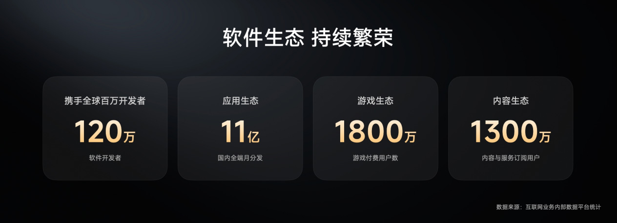 龐大的用戶規(guī)模帶動小米軟件生態(tài)持續(xù)繁榮。據(jù)本次大會披露,小米軟件開發(fā)者數(shù)量目前已達到120萬,小米應用生態(tài)的國內(nèi)全端月分發(fā)量突破11億,其中游戲生態(tài)的付費用戶數(shù)突破1800萬,內(nèi)容生態(tài)的訂閱用戶數(shù)突破1300萬。去年生態(tài)大會上推出的“人車家全生態(tài)”完美適配項目,已有50+開發(fā)者達成多終端完美適配意向。