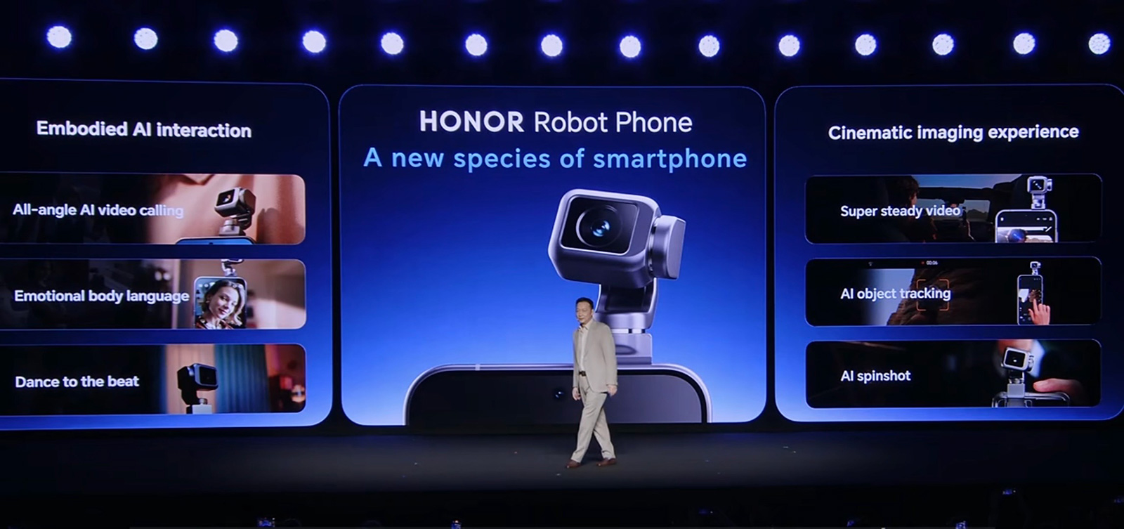 先說說更受矚目的榮耀Robot Phone,現(xiàn)場(chǎng)演示的真機(jī)其實(shí)與去年在國(guó)內(nèi)展出的模型機(jī)改動(dòng)不大,榮耀CEO李健親自公布了這款重磅產(chǎn)品的眾多細(xì)節(jié)。從官方視頻看,榮耀Robot Phone的旋轉(zhuǎn)攝像頭采用橫向側(cè)滑保護(hù)蓋,需要手動(dòng)側(cè)滑開啟。旋轉(zhuǎn)鏡頭打開時(shí)是自動(dòng)翻轉(zhuǎn),不過開啟速度似乎偏慢。