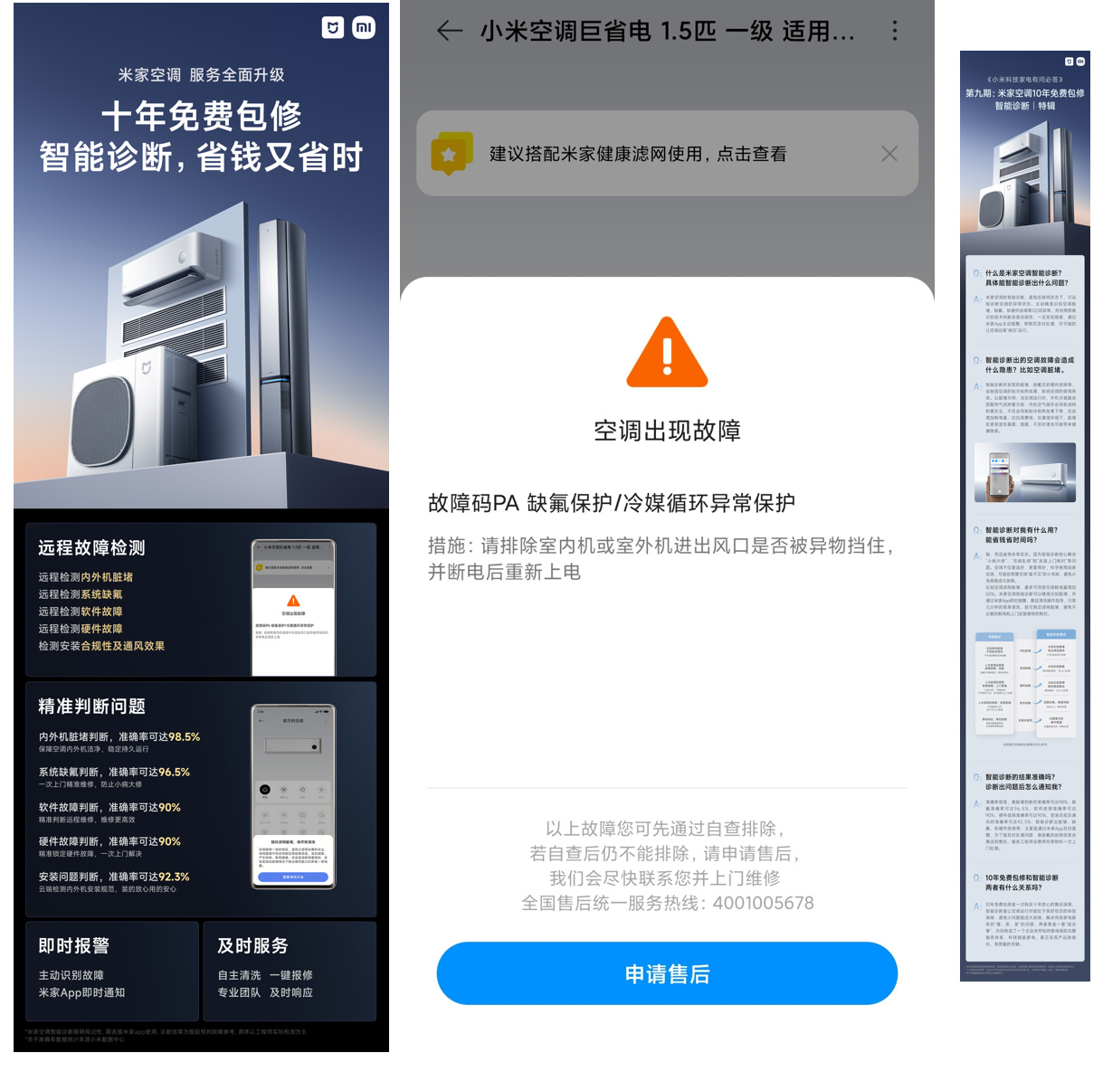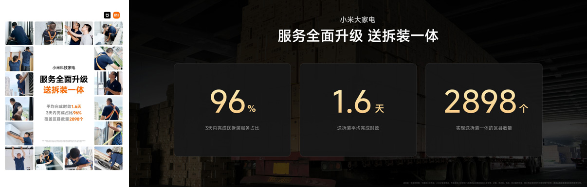 去年9月,小米在空調(diào)行業(yè)就率先推出了全品類10年免費包修,整機(jī)免費、配件免費、服務(wù)免費,覆蓋米家空調(diào)全品類,掛機(jī)、柜機(jī)、中央空調(diào)等均可享受。更早之前的2024年,小米也是在行業(yè)率先推出了“送拆裝一體”服務(wù):一次上門搞定空調(diào)配送、拆舊機(jī)、裝新機(jī),廣受好評。