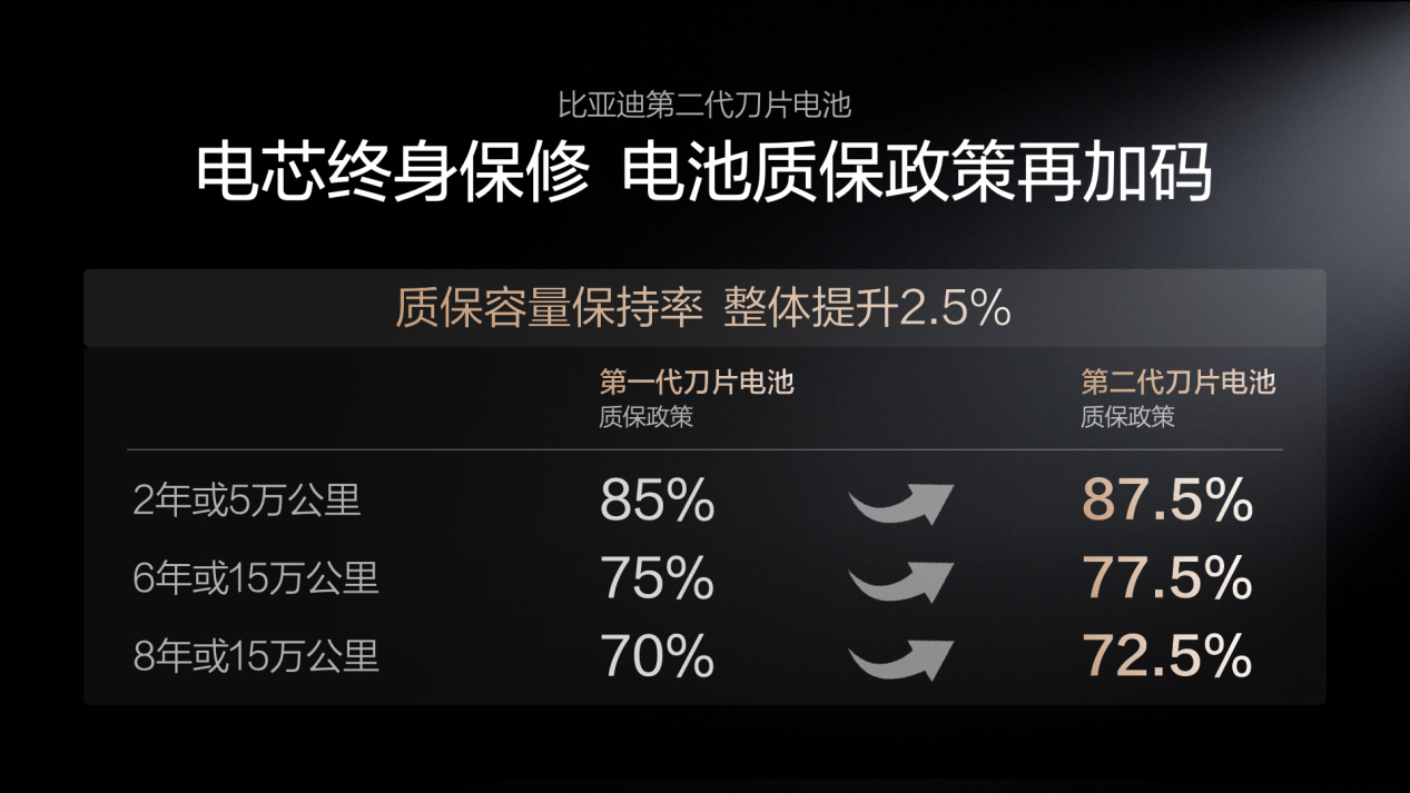 技術(shù)底氣催生品質(zhì)承諾,比亞迪同步宣布第二代刀片電池質(zhì)保政策全面加碼,為用戶送上最強定心丸。比如在6年或15萬公里質(zhì)保周期內(nèi),電池容量保持率標(biāo)準(zhǔn)由75%提升至77.5%,容量低于該標(biāo)準(zhǔn)即可享受免費包換服務(wù),保障標(biāo)準(zhǔn)更嚴(yán)苛、用戶權(quán)益更豐厚。與此同時,第二代刀片電池電芯實現(xiàn)終身保修,覆蓋車輛全使用周期,徹底打消用戶對電池長期使用的后顧之憂,以實打?qū)嵉恼撸∽C對電池壽命與品質(zhì)的絕對信心。