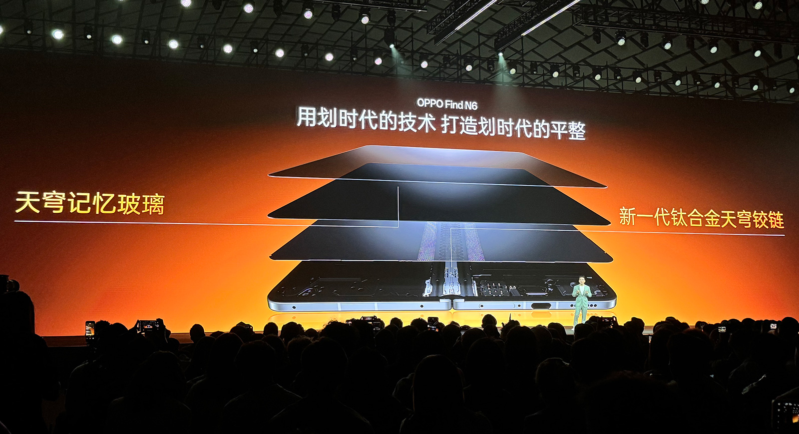 根據(jù)真機(jī)上手體驗(yàn)和觀察,OPPO Find N6內(nèi)屏展開(kāi)后在多種角度下看折痕近乎消失,即便在屏幕全黑狀態(tài)時(shí)的平整度也相當(dāng)高,手指觸摸屏幕中部時(shí),凹陷感極為輕微。可以說(shuō)Find N6折痕表現(xiàn)和平整度,“不怕黑、不挑角度”是當(dāng)前已上市折疊屏機(jī)型的T0級(jí)水準(zhǔn)。該機(jī)還通過(guò)了萊茵60萬(wàn)次折疊久用平整測(cè)試,劉作虎指出,OPPO Find N6的發(fā)布是“折疊手機(jī)史上重要的一天”。