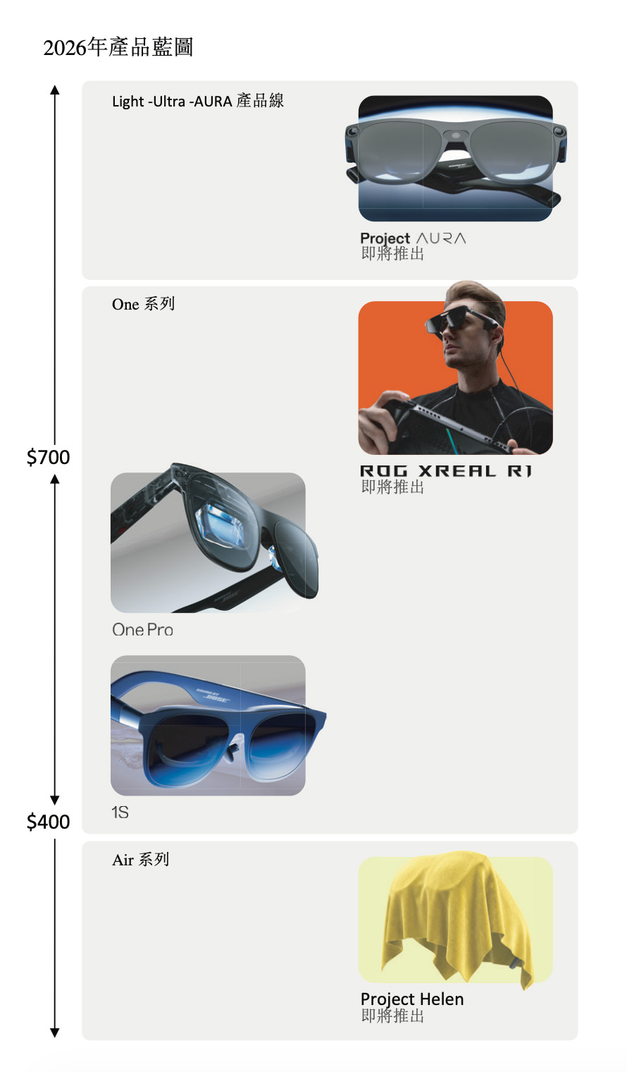 在技術(shù)與產(chǎn)品層面,XREAL構(gòu)建了“自研光機(jī)+自研芯片”的核心護(hù)城河,旗下Air系列與One系列產(chǎn)品廣受全球消費(fèi)者認(rèn)可。面對(duì)2026年的市場(chǎng)機(jī)遇,XREAL公布了全產(chǎn)品線矩陣藍(lán)圖,包括:面向大眾市場(chǎng)的普及型眼鏡“Project Helen”;與頂級(jí)電競(jìng)品牌ROG(玩家國(guó)度)合作的專業(yè)電競(jìng)眼鏡“R1”;以及與Google(谷歌)共同開發(fā)、深度集成空間計(jì)算與多模態(tài)AI能力的下一代旗艦XR產(chǎn)品“Project Aura”等。