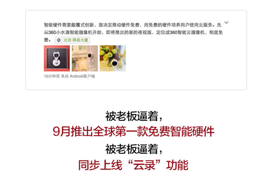 7月22日,“尋找中國(guó)創(chuàng)客”七月論壇在北京召開(kāi),360周鴻祎在會(huì)上宣布小水滴攝像頭硬件永遠(yuǎn)免費(fèi),前期將以100萬(wàn)臺(tái)進(jìn)行試驗(yàn)。在未來(lái),360還將以此為起點(diǎn),不斷嘗試硬件免費(fèi)模式,如果小水滴攝像頭免費(fèi)效果好,以后的行車(chē)記錄儀、兒童手表也會(huì)繼續(xù)免費(fèi)。