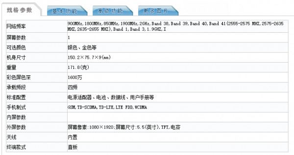 現(xiàn)在,我們在工信部發(fā)現(xiàn)了該機的身影,工信部給出的圖片顯示該機配備5.5英寸顯示屏,支持GSM/TD-SCDMA/WCDMA/TD-LTE/LTE FDD網(wǎng)絡(luò),尺寸為150.2×75.7×9mm,重171.8克,其余配置和安兔兔曝光的沒什么區(qū)別。