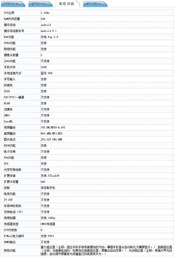 安兔兔給出的圖片顯示,該機搭載MT6753八核1.3GHz處理器,內(nèi)置2GB內(nèi)存和16GB機身存儲空間,提供800/1300萬像素攝像頭,屏幕分辨率為1080p,但尺寸還不太確定。