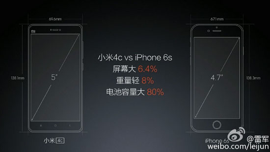 每次蘋果發(fā)布新機后,大家也都是忙著作對比,顯示自己的長處。小米總裁雷軍稱小米4c輕了11克(8%),同時屏幕大6.4%、電池容量大80%。