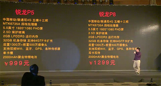 神舟銳龍系列手機全部均是移動聯(lián)通雙4G以及全金屬機身。銳龍P5搭載聯(lián)發(fā)科6735A處理器,5英寸1080P屏幕,2.5D弧邊玻璃,2GB運行內(nèi)存配搭32GB機身儲存,1300萬主攝像頭和500萬前置攝像的組合,2000mAh容量電池。銳龍P8同樣搭載了聯(lián)發(fā)科6735A處理器,而屏幕方面則提升到5.5英寸1080P屏幕,其他配置并沒有改變。售價分別為999元和1299元。